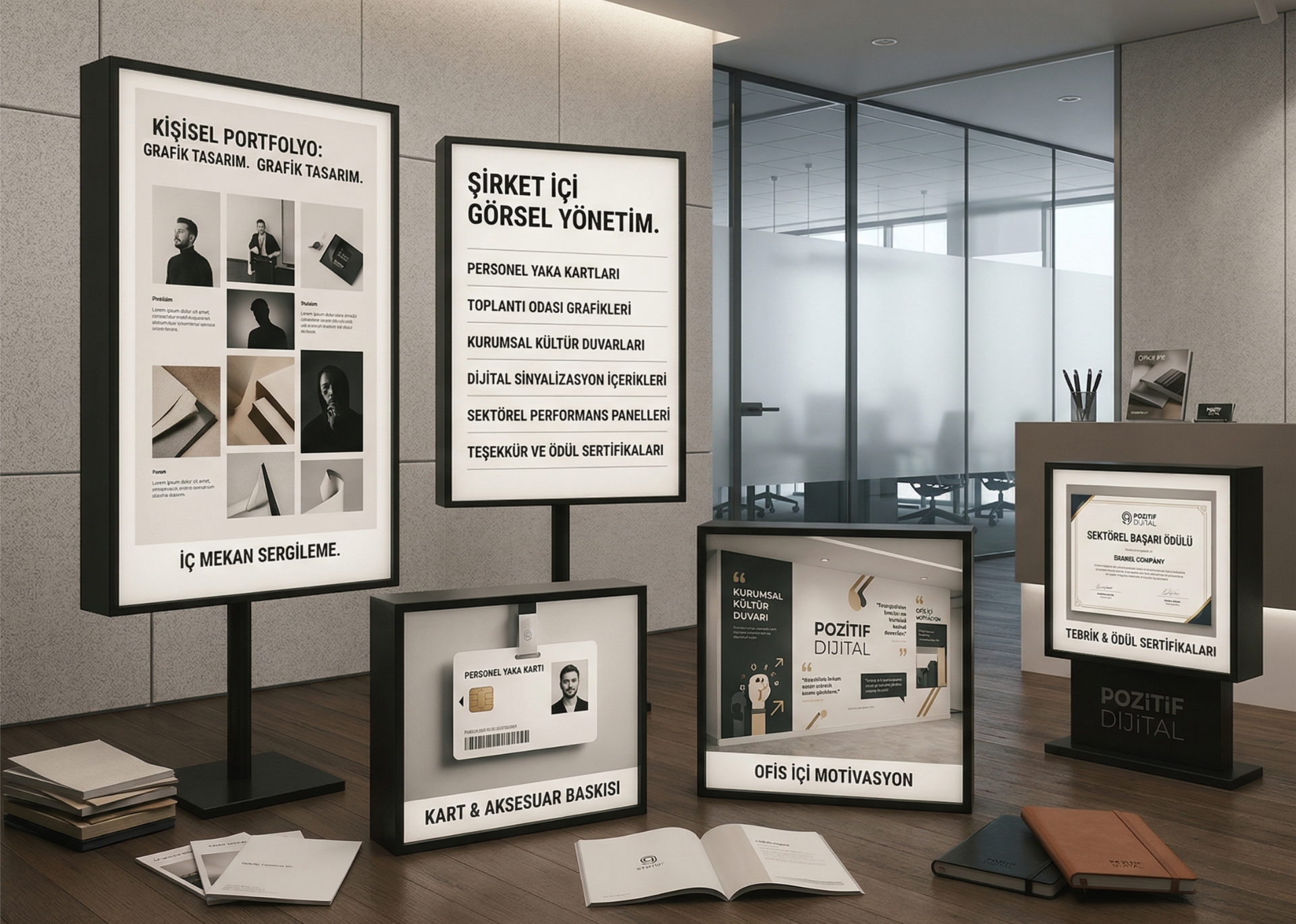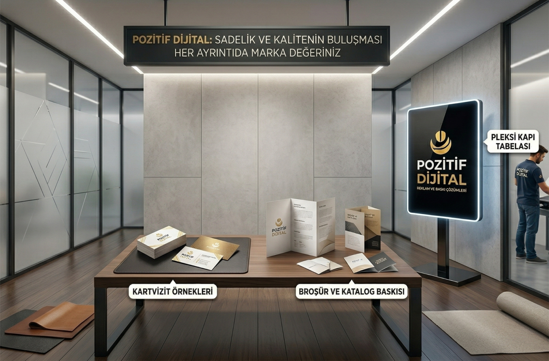 Pozitif Dijital olarak, markanızın fiziksel dünyadaki imzası oluyoruz. Kartvizitten tabelaya, kurumsal kimlik tasarımlarından büyük ölçekli baskı çözümlerine kadar her aşamada yanınızdayız. Sadece tasarım yapmıyor; en kaliteli malzemelerle baskı ve montaj süreçlerini profesyonelce yönetiyoruz.